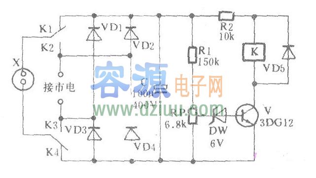 用1N4004二極管。DW用6V穩壓管。R2用3W的電阻。K甩額定工作電壓為直流24V的JRX-13F型繼電器。