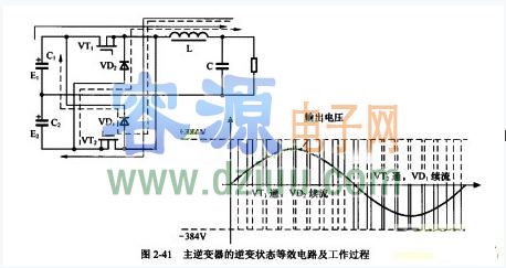 的等效電路及工作過程。我們分析其工作過程時(shí),先按輸出電壓正半周和負(fù)半周把它分解為兩個(gè)降壓型開關(guān)電路(Buck)。在輸出電壓的正半周時(shí),降壓開關(guān)電路由開關(guān)管VT1、續(xù)流二極管VD2和電感「組成。VTI開通時(shí)電容C,上的正電壓(384V)通過電感「向負(fù)載輸出功率,電感「中的電流線性上升;當(dāng)VT,由開通轉(zhuǎn)為截止后,