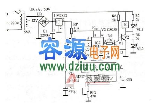 C3兩端電壓不能突變,IC2的2腳電壓低于Vcc/3,IC2內部的觸發器置位,3腳輸出高電平,使V1飽和導通,V2截止,K不能吸合,其常閉觸頭接通,將R4短接,充電電路對電池GB恒流充電。