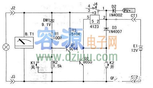 電路是由蓄電池、控制器、用電器及充電部分組成。其中:穩壓二極管DWl、電阻R1、R2組成欠電壓檢測電路,三極管Q1、Q2及電阻R3和繼電器組成欠電壓自動斷電控制、執行電路。K1、K2分別為手動“關”、“開”機按鈕開關,PV+是太陽能電池板充電輸入正極接線端。負載最好用直流1 2V電子節能燈。 <<提示:容源電子網為廣大電子愛好者提供電路圖專題網站“容源電路圖網”,歡迎訪問。匯聚大量電路圖與你共同分享。》