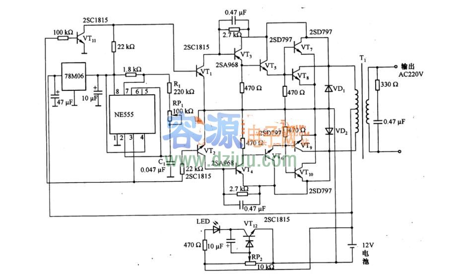 如圖是由NE555等構成的逆變器電路,它將蓄電池的十12V直流電壓變換為220V的交流輸出電壓。電路中,NE555為振蕩電路,振蕩頻率由R1、RP1的阻值和C1決定,調節RP1的阻值,使其為50HZ。NE555的3腳輸出脈沖信號,一路直接加到VT2的基極,另一路經VT11反相器加到VT1的基極,VT1,和VT2得到相位差180°的脈沖電壓,該脈沖電壓經VT1和VT2進行整形,再經VT3和VT4進行脈沖放大,驅動由VT5、VT7、VT8和VT6、VT9、VT10構成的功率放大器。功率放大器開關工作可將+12V電池電壓變換為方波電壓,該電壓經升壓變壓器T1變為220V的方波交流輸出電壓。VD1和VD2為浪涌吸收二極管,VT12,等為阻止電池過放電的電路,78M06為NE555提供+6V穩定的工作電壓。