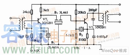 陶瓷濾波器收音機中放電路 如圖所示為兩端及三端陶瓷濾波器在調幅半導體收音機中放電路中的應用。陶瓷濾波器B1和B2用于465kHz中頻旁路,B1則用于中頻的耦合。B1使用窄帶型濾波器,它并聯在VT1的發射極電阻上,有