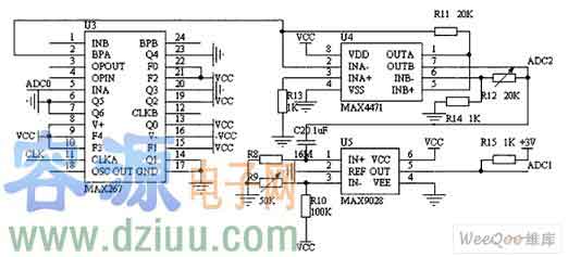 如圖所示,電路由濾波和放大兩部分組成。其中MAX267是MAXIM公司出產的一個集成濾波器,可以構成低通、帶通、高通、等多種方式,使用靈活,性能遠遠優于采用集成運放組成的濾波電路!
