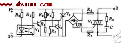 過零觸發型AC—SSR為四端器件,其內部電路如圖1。1、2為輸入端,3、4為輸出端。R0為限流電阻,光耦合器將輸入與輸出電路在電氣上隔離開,V1構成反相器,R4、R5、V2和晶閘管V3組成過零檢測電路,UR為雙向整流橋,由V3和UR用以獲得使雙向晶閘管V4開啟的雙向觸發脈沖,R3、R7為分流電阻,分別用來保護V3和V4,R8和C組成浪涌吸收網絡,以吸收電源中帶有的尖峰電壓或浪涌電流,防止對開關電路產生沖擊或干擾。