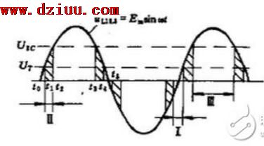 要指出的是所謂“過零”并非真的是電源電壓波形的零處,而是指在10~25V或-(10~25)V區域內進行觸發,如圖2。圖中交流電壓分三個區域,Ⅰ區為-10V~+10V范圍,稱為死區,在此區域中加入輸入信號時不能使SSR導通。Ⅱ區為10~25V和-(10~25)V范圍,稱為響應區,在此區域內只要加入輸入信號,SSR立即導通。Ⅲ區為幅值大于25V的范圍,稱為抑制區在此區域內加入輸入信號,SSR的導通被抑制。