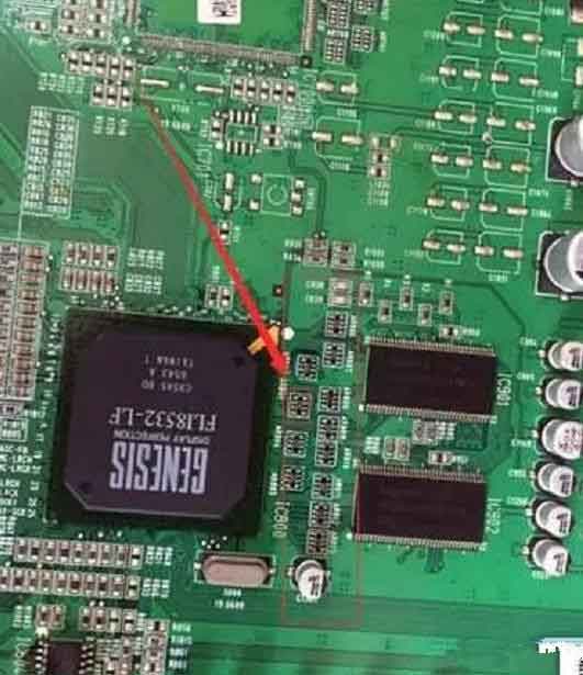憑著先簡單后復(fù)雜的維修原則先去檢查主芯片與閃存之間的線路中轉(zhuǎn)件排阻,發(fā)現(xiàn)圖中排阻67歐與其他正常排阻27歐高出太多,更換后試機(jī)正常,維修結(jié)束。此類故障很常見,曾在創(chuàng)維某些機(jī)型中遇見數(shù)十例。提醒大家在遇到主板導(dǎo)致花屏的故障時,優(yōu)先考慮主芯片與閃存之間的通信排阻,和主芯片到LVDS屏線接口的排阻。高手略過,不喜勿噴。