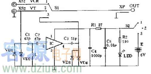 XS1,XS2是兩個75Ω電纜插口,XP是連接有0.5m長左右的75Ω同軸電纜直插頭。使用時插頭XP(OUT)插入電視機的天線插座里,錄像機射頻輸出插入XS1(VCR)里,電視天線插入插座XS2(VT)里。當雙刀開關S1,S2撥至位置