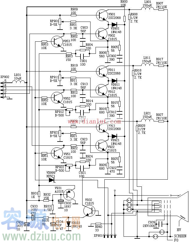 CRT彩色電視機放映分立元件應用的電路圖
