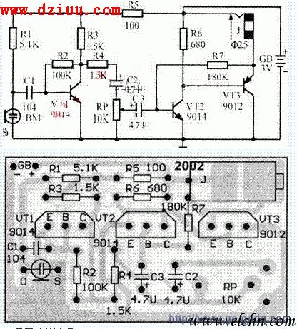 本電路由話筒、前置低放、功率放大電路和耳機(jī)等部分組成。原理電路圖見圖1,其印刷板電路圖見圖2。