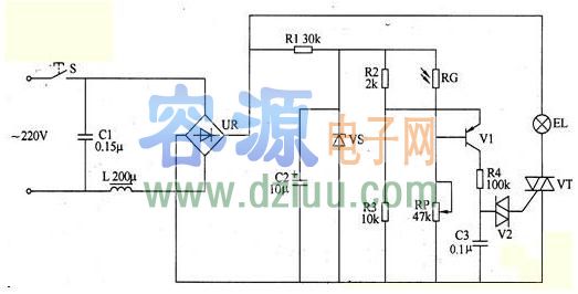 光控電路由光敏電阻器RG、電阻器肥-R4、電位器RP、電容器C3、晶位管V1、雙向觸發二極管V2和晶閘管VT組成。 <<版權聲明:本文由容源電子網(www_dziuu_com)整理提供,部分內容來源于網絡,如有侵犯到你的權利請與我們聯系更正。》