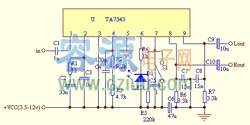 TA7343的供電電壓為3.5--12v,具有制作元件少,不需外接分離度調(diào)節(jié)元件,仍能保持較高的聲道分離度,