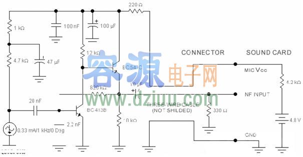 都有一個麥克風輸入、揚聲器輸出、線路輸入和輸出。麥克風輸入設計的動態阻抗話筒只在200~600歐的范圍。拉扎爾已經適應聲卡使用一個共同的駐極體麥克風使用這種電路。他提出了一個復合放大器使用兩個晶體管。 <<版權聲明:本文由容源電子網(www_dziuu_com)整理提供,部分內容來源于網絡,如有侵犯到你的權利請與我們聯系更正。》