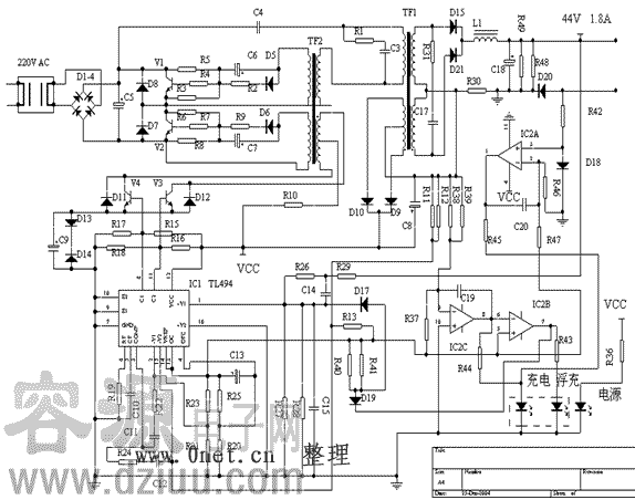 此電壓給C4充電,經TF1高壓繞組,TF2主繞組,V2等形成啟動電流。TF2反饋繞組產生感應電壓,使V1,V2輪流導通。因此在TF1低壓供電繞組產生電壓,經D9,D10整流,C8濾波,給TL494,LM324,V3,V4等供電。此時輸出電壓較低。TL494啟動后其8腳,11腳輪流輸出脈沖,推動V3,V4,經TF2反饋繞組激勵V1,V2。使V1,V2,由自激狀態轉入受控狀態。TF2輸出繞組電壓上升,此電壓經R29,R26,R27分壓后反饋給TL494的1腳(電壓反饋)使輸出電壓穩定在41.2V上。R30是電流取樣電阻,充電時R30產生壓降。此電壓經R11,R12反饋給TL494的15腳(電流反饋)使充電電流恒定在1.8A左右。另外充電電流在D20上產生壓降,經R42到達LM324的3腳。使2腳輸出高電壓點亮充電燈,同時7腳輸出低電壓,浮充燈熄滅。充電器進入恒流充電階段。而且7腳低電壓拉低D19陽極的電壓。使TL494的1腳電壓降低,這將導致充電器最高輸出電壓達到44.8V。當電池電壓上升至44.8V時,進入恒壓階段。