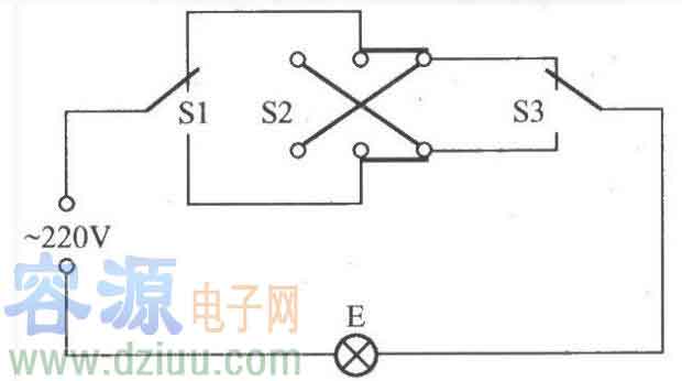 三控開關(guān)是指在三個(gè)不同地方都能各自獨(dú)立地控制同一盞電燈的點(diǎn)亮或熄滅,其電路如圖所示。圖中S1、S3為1×2單刀雙擲開關(guān),S2則要用2×2雙刀雙擲開關(guān)。