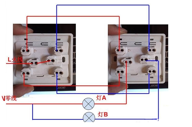 進戶紅線接到另一個雙控開關上接線柱,中接線柱為紅線接到電燈的另一側,下接線柱和進戶藍線連接。