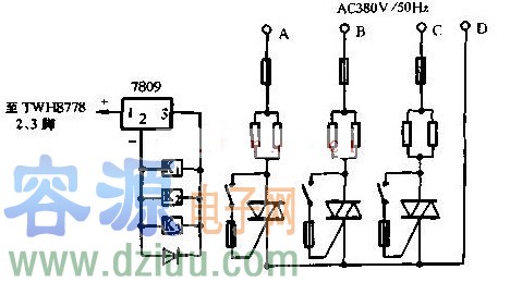 今天為大家介紹的是一款采用三相交流電供電的大型電孵器的電路。主要電路圖如下所示,三端穩(wěn)壓器7809輸出端接三只繼電器,用來(lái)控制三相電源中3只VS電熱絲功率不小于10KW.塑封的7809需加