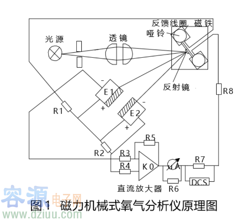 1.1磁機械式氧分析原理:由于氧氣分子具有較強的順磁性,氧氣分子會向著磁場增強的方向移動。通過兩種不同的氧含量氣體在磁場作用下所形成的的壓力差,并根據(jù)機械原理采用一根極為靈敏的鋼絲來懸吊啞鈴球,兩種不同的氧含量氣體在磁場中的壓力差會使偏移,而啞鈴球偏轉(zhuǎn)角度與混合氣體中含氧量濃度成正比,并由特定的光源、反射鏡以及感光原件所組成單元準確地測定出啞鈴球的偏轉(zhuǎn)角度,進而確定混合氣體中氧含量的百分比。
