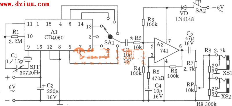 。集成電路CD4060是帶有振蕩器的十四級分頻器。晶體SJT產生30720Hz的微弱信號頻率,與Cl及CD4060內部反相器構成晶體振蕩。Rl用以提供反饋回路,僅在晶體的基頻上產生振蕩,振蕩中心頻率為30720Hz。微調電容Cl可使頻率精確調諧在中心頻率上。SA置于CD4060的13腳。30720Hz經CD4060九級(512次)分頻后,由13腳輸出高精度60Hz信號頻率,經電容C3耦合到運放器741的2腳進行信號放大,然后從741的6腳輸出。調節電位器RP時,XSl插口輸出0~1V,XS2插口輸出0~0.1V的低頻信號。其中,C2、C5為電源濾波電容。C3、C6為741的輸入、輸出耦合電容。R5、C4為高頻補償電路。R2、R4構成分壓衰減電路。R6為反饋電阻用以提高電路的穩定度。CD4060各腳的輸出頻率:3腳為2Hz,2腳為4Hz,13腳為60Hz,14腳為l20Hz,6腳為240Hz,4腳為480Hz,5腳為960Hz,7腳為l920Hz。本文由www.gsdpw.cn整理提供,部分內容來源于網絡,如有侵犯到你的權利請與我們聯系更正。