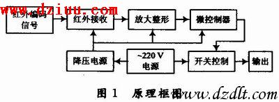 智能紅外遙控開關(guān)主要由紅外接收、放大整形、微控制器、開關(guān)控制以及降壓電源等模塊組成,其原理框圖如圖1