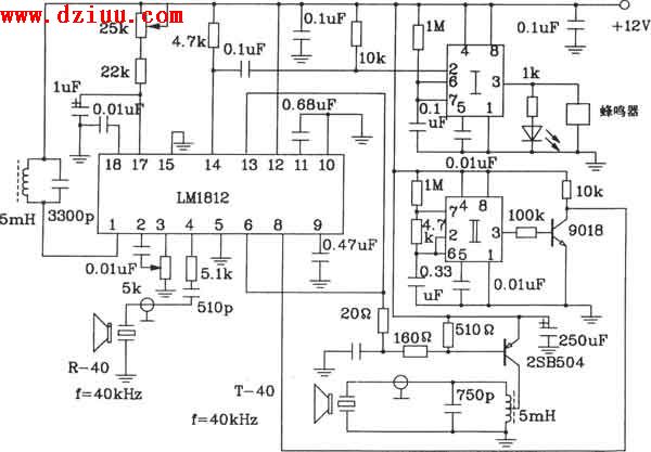 LM1812構成汽車超聲波倒車防撞報警器 電路采用LMl812并由時基電路II來控制LM1812的發送與接收(LMl812即發送又接收)。控制距離