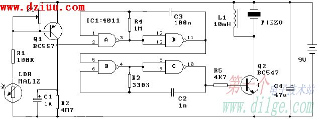 ,Q1獲得偏置導通,由CD4011組成的振蕩器開始工作,振蕩信號經Q2放大后驅動壓電片發出報警信號。 本文由www.gsdpw.cn整理提供,部分內容來源于網絡,如有侵犯到你的權利請與我們聯系更正。