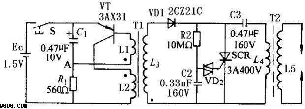 還通過R2向C2充電。在C2的電壓還沒有充到觸發管VD2的導通電壓(約30V左右)以前,C3沒有放電回路,電壓越來越高。R2、C2、VD2、SCR、C3、L4、L5組成充放電回路及打火回路。當C2的電壓充到觸發二極管VD2的導通電壓時,VD2被擊穿,電容C2通過VD2向晶閘管的觸發極放電,使晶閘管SCR導通,把C3儲存的能量迅速放掉,在L5感應出萬伏