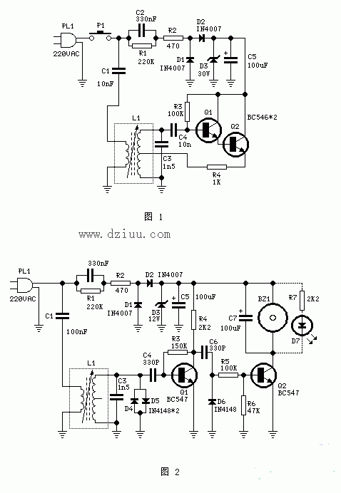 接收部分(見下圖2):由發射部分過來的135KHz的正弦波通過電力線路傳播至接收部分通過C1并由L1、C3構成的選頻電路取出135KHz信號。該信號經Q1放大并整形至幅度為12V的方波信號。D4、D5構成限幅電路保證Q1的基極峰值電壓小于1V,以防止電力線路網絡中各種異常干擾脈沖而損壞Q1。D6的作用是過濾掉信號中的負極性部分,并由Q2驅動報警部分工作。C7在這里用來保持輸出部分平穩,過濾掉信號中殘余部分。12V電源部分由C2、D1、D2、D3、C5等組成。