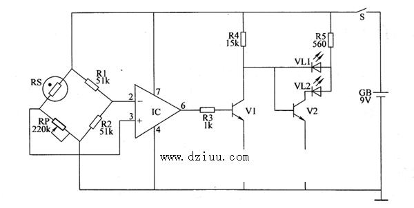 若育秧棚內濕度增大,則RS的阻值變小,當濕度超過設定值時,IC因正相輸人端電位高于反相輸入端電位而輸出高電平,使VI導通,VL1發光,指示棚內濕度過大,提醒農戶及時通風以減小棚內濕度;