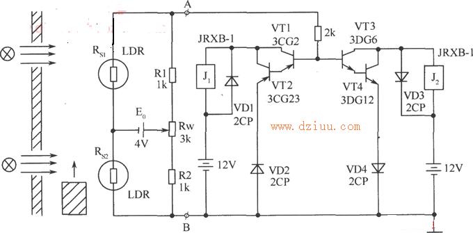 遮光或光照,調節Rw,使電橋平衡。UAB=0V。測量時,當物體由下向上運動時,Rs2首先被遮光,阻值增大,Rs1被光照,阻值較小,電橋失衡,UA>UB,UAB>0V,則VT1、VT2截止,VT3、VT4導通,繼電器J1保持斷開