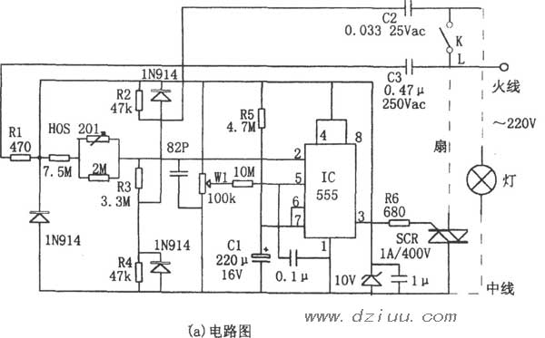 濕度從40%~80%變化時,其阻值變化范圍約為:從700MΩ變至700kΩ,相應使555②腳電平從低電平變至高電平(>1/3VDD)。單穩(wěn)定時電路由IC和濕敏網(wǎng)絡、R5、C1等組成。當濕度超過預定值時,555②腳電位為高電平,555發(fā)生復位,③腳輸出的低電平使可控硅SCR導通,接通排氣扇電源,進行排氣降低濕度。排放時間由定時時間常數(shù)R5C1和控制端⑤腳的電平所決定。調(diào)節(jié)W1,可預置排放時間。本控制器可在當室內(nèi)的