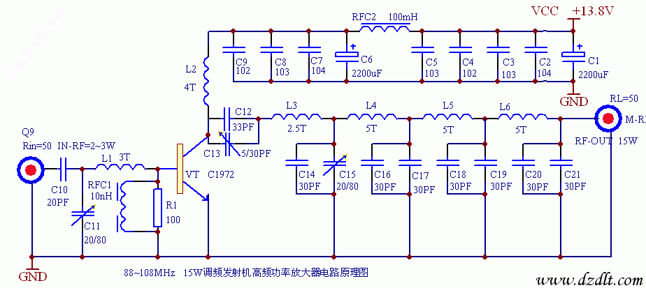 參數,電路工作中心頻率約為98MHZ,輸入約2W的射頻功率時,額定輸出可達15W。為保88~108MHZ內的任一頻點時輸出達到額定值,可根據前級的中心頻率對部分元件作適當