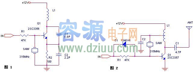 使用了聲表器件,電路工作非常穩(wěn)定,即使手抓天線、聲表或電路其他部位,發(fā)射頻率均不會(huì)漂移。和圖一相比,圖二的發(fā)射功率更大
