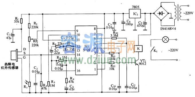 后由IC1的②腳輸出,驅動VT1使繼電器K工作,其觸點K1接通電燈電源,點亮電燈。 <<版權聲明:本文由容源電子網(www_dziuu_com)整理提供,部分內容來源于網絡,如有侵犯到你的權利請與我們聯系更正。》