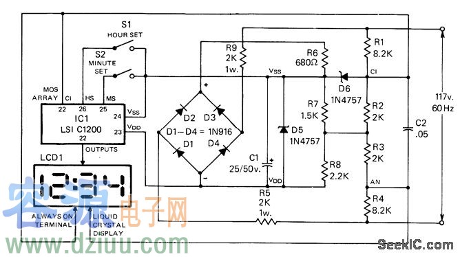 使用由大規模集成電路計算機系統做成的C1200時鐘電路具有時間設定,秒鐘、分鐘和小時分割,七段解碼,顯示驅動和開關的功能。四位液晶顯示面板是MGC-50。S1和S2以2Hz的速率提前設置分鐘或小時。為了使其能用作時間