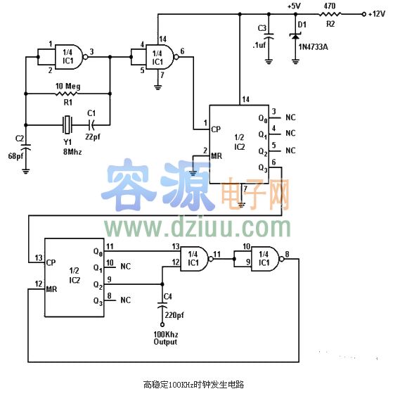 高穩定100KHz時鐘發生電路 <<版權聲明:本文由容源電子網(www_dziuu_com)整理提供,部分內容來源于網絡,如有侵犯到你的權利請與我們聯系更正。》