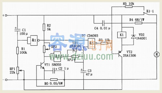 防止電機在啟動時產(chǎn)生的大電流造成電路的誤動作,由Cl、Rl、RPl及與非門l組成了開機保護延時電路。電機開始啟動時,Cl上無電壓,