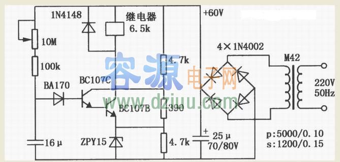 隨著16μF電容的充電,過(guò)一段時(shí)間后,其上電壓達(dá)到高電平,兩個(gè)三極管都導(dǎo)通,繼電器延時(shí)吸合。延時(shí)時(shí)間可達(dá)60s。延時(shí)的時(shí)間長(zhǎng)短可通過(guò)10MΩ電阻來(lái)調(diào)節(jié)。《版權(quán)聲明:本文由容源電子網(wǎng)(www_dziuu_com)整理提供,部分內(nèi)容來(lái)源于網(wǎng)絡(luò),如有侵犯到你的權(quán)利請(qǐng)與我們聯(lián)系更正。》