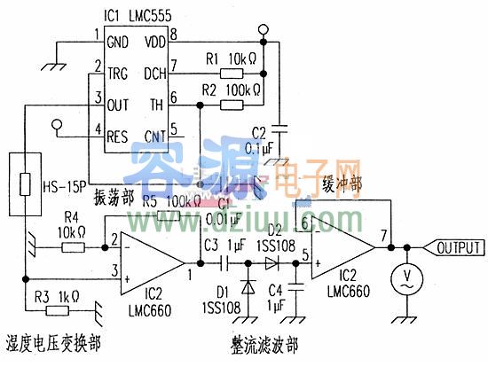 下圖是濕度表的電路,由五個部分組成。濕度,電壓變換部為HP-15傳感器:振蕩部由時基電路為傳感器提供600Hz矩形波:放大部由運放構成11倍放大器:放大器的輸出被倍壓整流;最后由運放接成跟隨器作驅動輸出。 <<版權聲明:本文由容源電子網(www_dziuu_com)整理提供,部分內容來源于網絡,如有侵犯到你的權利請與我們聯系更正。》