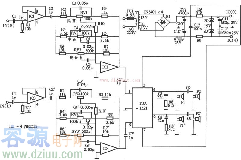 基于TDA1521的立體聲一體化有源音箱電路
