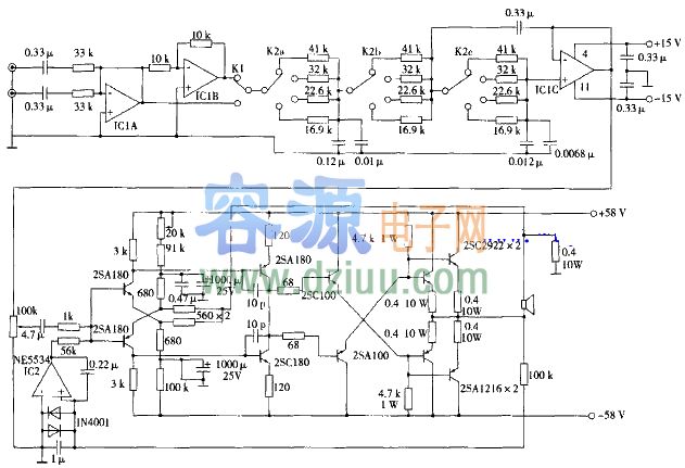 伺服均衡相位、音量控制線路的設計特點是從音源或前級輸出的信號經L,R輸入送到運算放大IC1A的輸入端,開關K1和IC1B