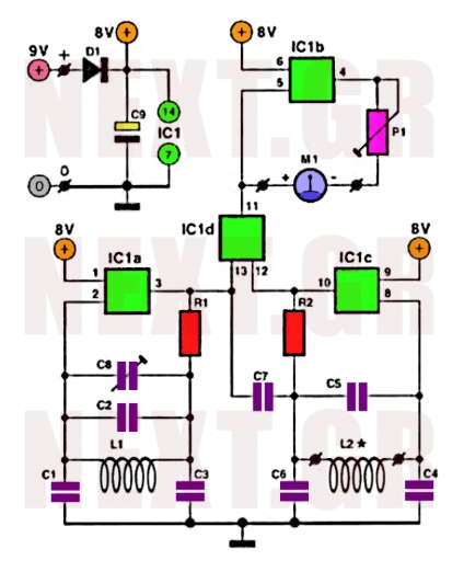 您將同意很難找到更簡單的檢測器電路。僅使用一個集成電路4030,一個動圈微安表,一些電阻器,幾個電容器和兩個線圈。零件的總成本應低于15美元。該電路使用兩個由IC1a和IC1c門構成的Colpitts型LC振蕩器。C7在兩個振蕩器之間產生松散的電容耦合。