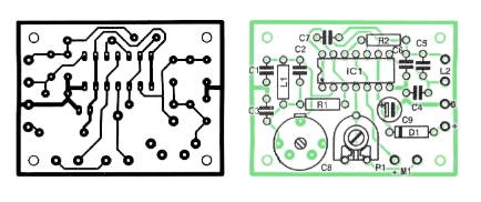 檢測器的PCB如下圖所示。除了L2之外,電路中沒有其他關鍵組件,因此構造不應出現特別的困難。只需將每個組件連接到零件視圖指示的位置即可。將光標P1向左轉到最低靈敏度位置。檢測線圈的芯線為空氣,直徑約為7.5厘米,帶有40匝漆包銅線或20厘米直徑和25匝漆包銅線。線圈纏繞在一塊圓木或塑料排水管或排水溝的周圍。靈敏度范圍通過增加線圈直徑來增加。L1已購買,如果具有帶螺紋的鐵氧體磁芯,則可以省略C8。如果實際上電路不是很靈敏,則可以稍微提高R2值。