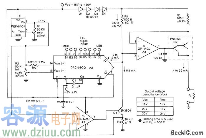 對于產業化經營的微處理控制,轉換8位TTL數字輸入從而來處理4到20mA范圍內的電流。固定的0.5mA電流被添加到DAC輸出電流,這個輸出電流在0到2.0mA之間轉換,然后被8相乘以產生電流為4-20mA