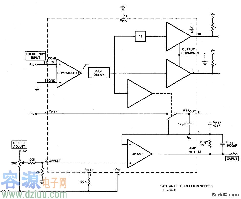轉換器產生一個輸出電壓,輸出電壓是和輸入頻率波形成線性正比。每個在比較器輸入上的過零產生一個精確的變量從而被分配到運算放大器的交界。 :
