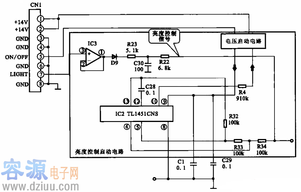 上圖所示為逆變器的電壓?jiǎn)?dòng)電路,它主要元器件為Ql,主要作用是為PWM控制芯片(TL1451CNS)提供啟動(dòng)信號(hào)。 在接通電源啟動(dòng)顯示器時(shí),插件CNI的⑤腳接收到控制電路傳來(lái)的高電平開(kāi)啟指