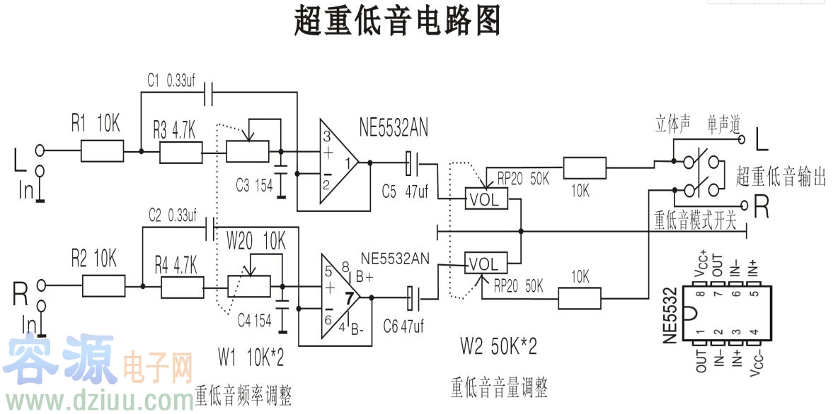說起超重低音電路不得不說說5532,及NE5532,在從多關(guān)于5532超重低音電路圖中可以看到,全部都是雙電源供電,比如正負(fù)12V,也有很多愛好者想通過單電源來供電制作成5532單電源超重低音電路也是可以的,本文就介紹NE5532單電源超重低音電路圖,供電電壓使用的是正12V供電,前提條件是對DC12必須濾波良好,如果DC12V電源濾波不良就會有噪聲,影響效果。