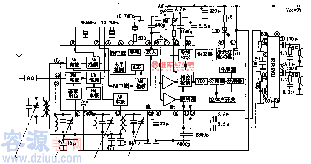 LAl816是集成電路工作電源電壓范圍為VCC=1.8-6V,最低工作電壓為1.8V(此時(shí)應(yīng)用DC/DC,升壓電路將1.5V電池升壓后供電),典型工作電壓為3V:功耗很小,AM時(shí)靜態(tài)電流為3MA,F(xiàn)M時(shí)靜態(tài)電流為8.6MA 。