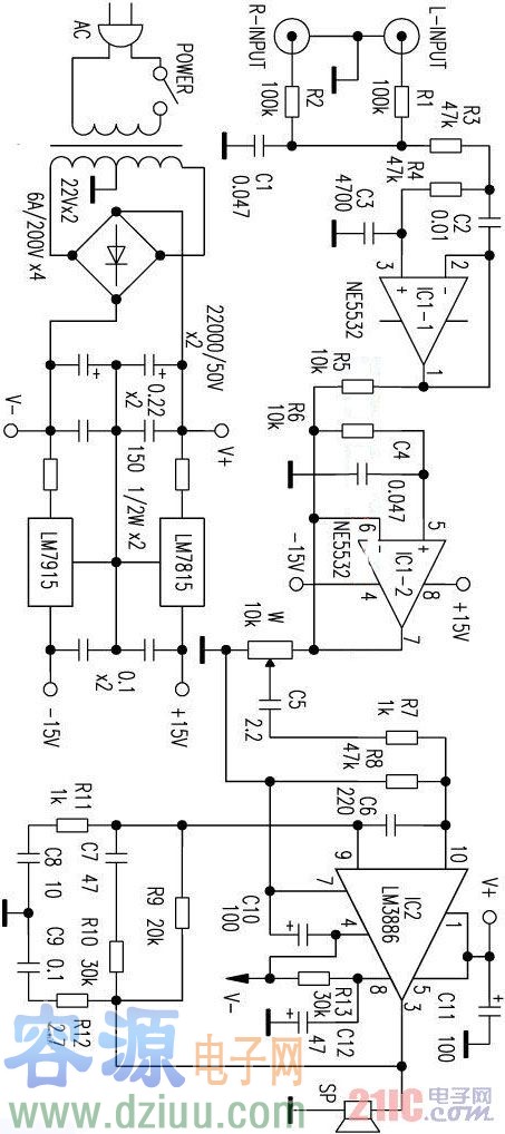LM3886是美國NS公司推出的新型的大功率音頻放大集成電路,其后面的TF為全絕緣封裝,和LM1875T相比,它的功率較大,在額定工作電壓下最大可達68W的連續不失真平均功率,同樣具有比較完善的過壓過流過熱保護功能,最可貴的是它具有自動抗開關機時的電流沖擊的功能,使揚聲器能夠安全的工作。