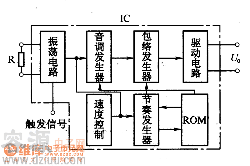 音樂集成電路有許多系列,且在控制功能上也各不相同,但它們的基本電路結構和工作原理大都是相同的。 音樂集成電路的內(nèi)部電路結構如圖所示,它由控制電路、振蕩電路、存儲器(ROM)、節(jié)拍發(fā)生器、音階發(fā)生器、