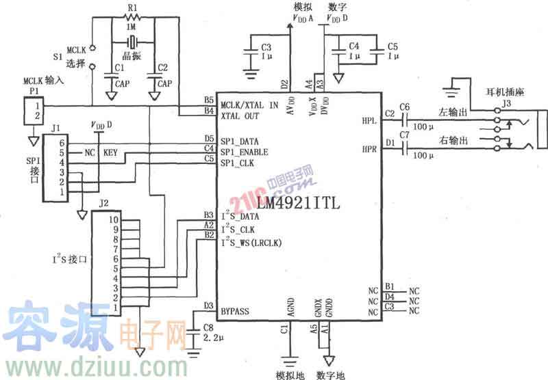 LM4921用于雙聲道耳機放大器電路由SPI接口總線J1輸入控制線信號:串行數據信號SPI-DATA,串行使能信號SPI-ENABLE,串行時鐘信號SPI-CLK。由I2S接口總線J2輸入全范圍的串行數字音頻信號:I2S數據信號I2S-DATA,I